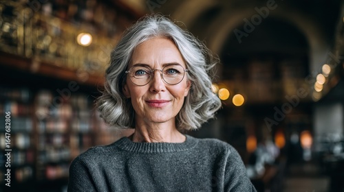 portrait of beautiful senior woman looking at camera with copy space successful mature business woman wearing eyeglasses happy old professor in standing in college library with gray hair no logos no