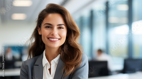 Portrait of beautiful young businesswoman smiling at camera in office.