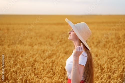 Portrait of beautiful young woman in hat on wheat field background. Side view.