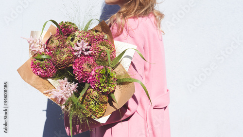 Portrait of beautiful young woman model holding exotic flower bouquet. Attractive mixed race female posing with flowers on a sunny day.