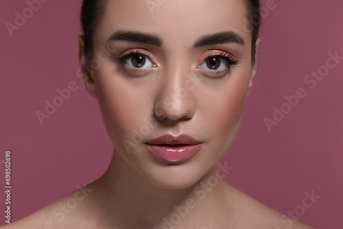 Portrait of beautiful young woman with perfect makeup on dark pink background, closeup