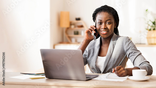 Portrait of black female entrepreneur talking on mobile phone, taking notes and smiling to camera