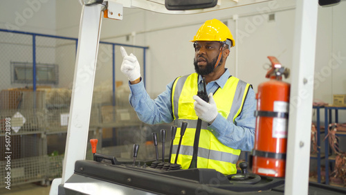 Portrait of black man worker working in large warehouse retail store industry factory. Rack of stock storage. Cargo in ecommerce and logistic concept. Depot. People lifestyle. Shipment service.