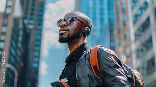 portrait of black stylish man walking on a sunny day with cell phone, wearing backpack and headset, in the city with skyscrapers. copy space for text.