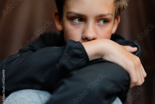 Portrait of blonde teenage boy on dark background outdoor. Low key close up shot of a young teen boy, adolescence. Selective focus. Loneliness, sadness, adolescent anxiety, emotional