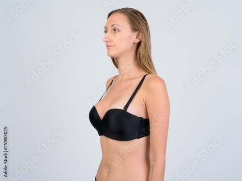 Portrait of blonde woman in bikini thinking