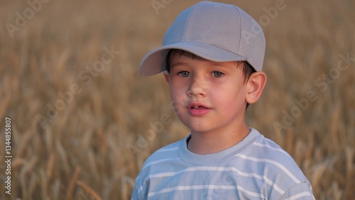Portrait of boy child kid in nature in wheat field. Thoughtful tired sweaty after long game kid child boy breathing heavily, standing in agricultural yellow field meadow lawn among ears of wheat.