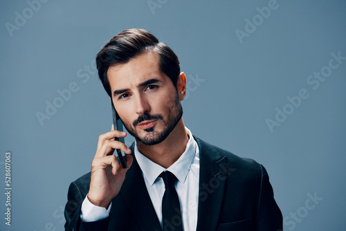 Portrait of business man with phone conversation and on blue background in business suit. Business portrait of a stylish man copy space