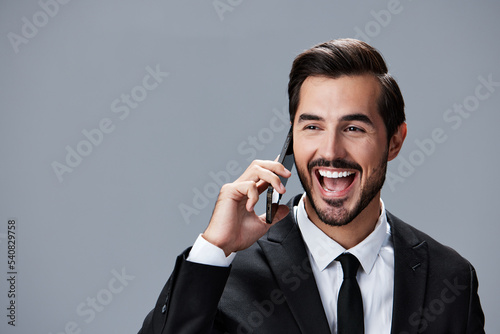 Portrait of business man with phone conversation and smile with teeth on gray background in business suit. Business portrait of a stylish man copy space