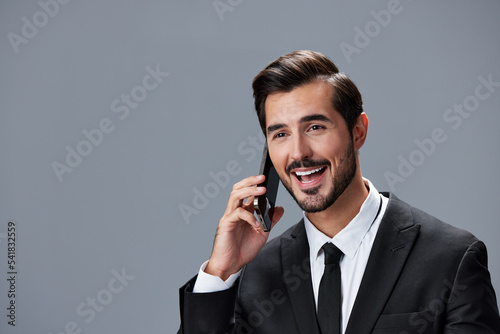 Portrait of business man with phone conversation and smile with teeth on gray background in business suit. Business portrait of a stylish man copy space