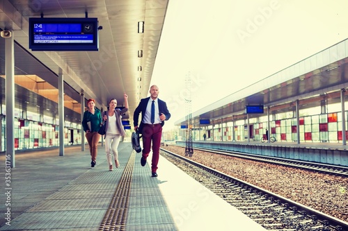Portrait of business people running to catch the train in station