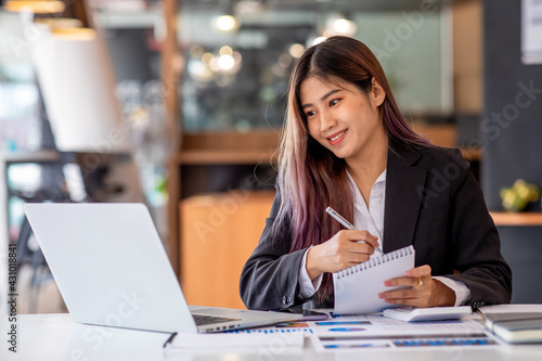 Portrait of Business young woman working on laptop computer doing finances,accounting analysis,report,data and pointing graph at the office.
