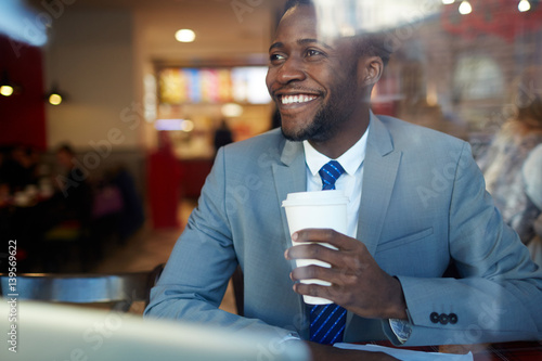 Portrait of businessman drinking coffee from disposable cup and looking away smiling in coffee shop, shot behind glass window