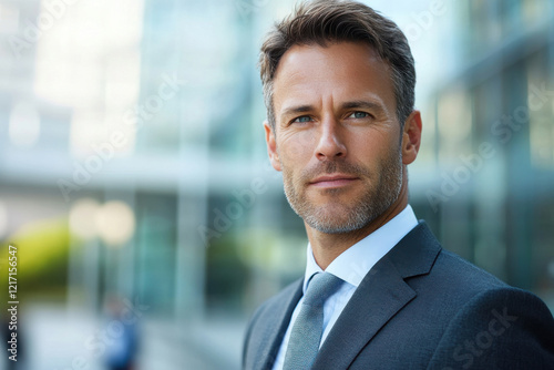 Portrait of caucasian businessman on blurred office building background. Confident, successful and smart man wearing suit outdoors. Generated AI
