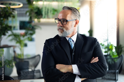 portrait of caucasian CEO business leader senior manager in eye glasses standing by window thinking