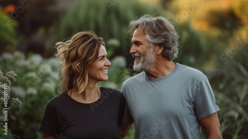 Portrait of Caucasian elderly couple sharing a tender moment in garden, reflecting deep affection and joy, surrounding blooms romantic ambiance, comfortable sportswear complements exercising in park