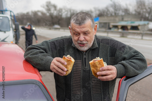 Portrait of Caucasian hungry senior driver ready to eat street food near his car