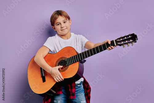 portrait of caucasian little boy 7-8 years old stand holding acoustic guitar, student of music school, posing with guitar. children interested in music and instruments. isolated purple background