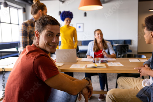 Portrait of caucasian male creative in casual office meeting with diverse colleagues using laptop