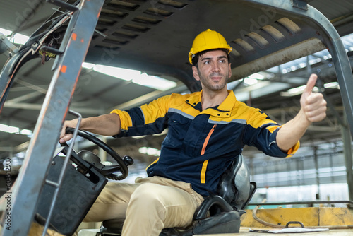 Portrait of caucasian man engineering thumbs up wear yellow hard hat sitting on forklift. Male industrial technician smiling relax time. success workman machine factory industrial.