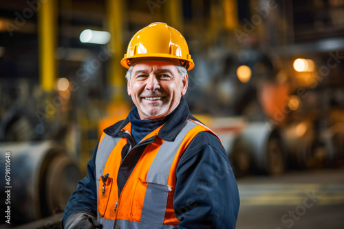 Portrait of caucasian steel worker adorned in safety gear, factory steel plant in the background
