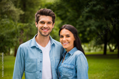 Portrait of charming people with beaming smile standing outdoors wearing denim jeans shirt