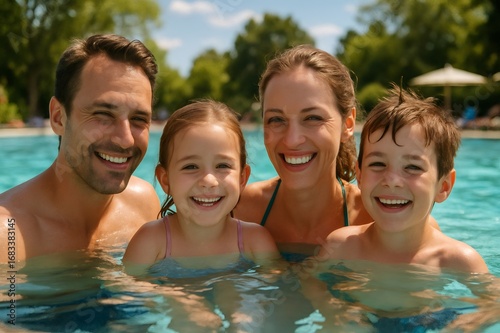 Portrait of cheerful family with two children having fun, smiling and playing together in the pool on a sunny day