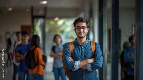 Portrait of cheerful male international Indian student with backpack standing at university campus corridor during break between lessons with students on background. Education and studying concept