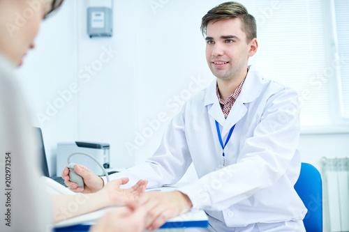 Portrait of cheerful young doctor measuring blood pressure using tonometer in office, copy space