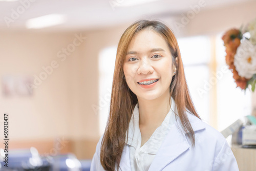 Portrait of Cheerful young female doctor posing and smiling at hospital, Medical healthcare and doctor service