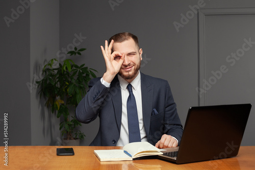 Portrait of confident cool smart businessman showing ok signs and working in office