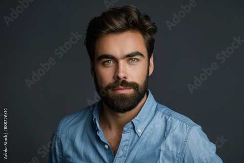 Portrait of confident European businessman with beard and dark hair in blue shirt looking at camera Shot in studio on dark gray background