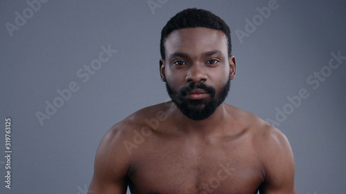 Portrait of confident handsome african half naked man applying perfume on body isolated on grey background.