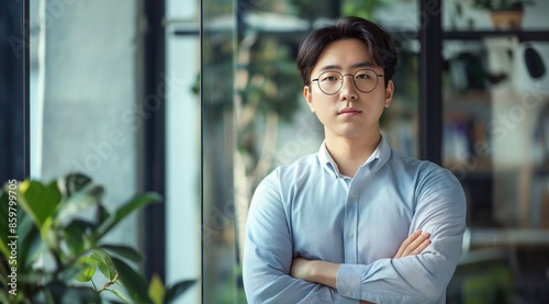 Portrait of confident korean young entrepreneur with arms crossed standing by glass wall in office.