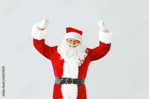 Portrait of cool Santa Claus showing "devil horns" gesture on light background