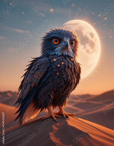 Portrait of cute kawaii eagle 3D cartoon in desert