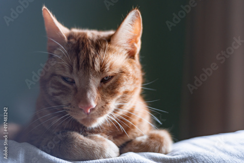 Portrait of cute little ginger cat sleeps on the sofa in living room