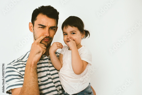 Portrait of cute little girl and her handsome father are hugging and playing together against white background. Playful dad and daughter touch they nose with finger, having fun.