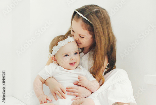 Portrait of cute little girl child with her sister baby sitting in white room at home near window