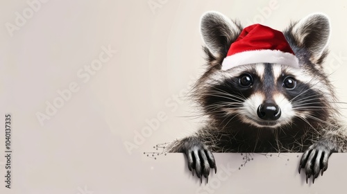 Portrait of cute raccoon in red santa claus christmas hat on plain background with copy space for text, christmas and new year celebration concept