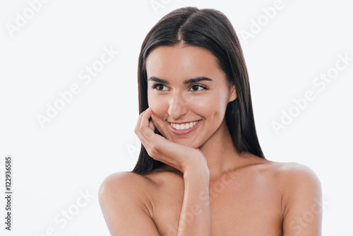 Portrait of cute young smling woman touches her clean skin, on white background.