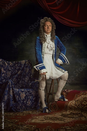 Portrait of elderly man dressed as medieval person, aristocrat with confident expression against vintage studio background. Concept of comparisons of eras, fusion of modernity and history, renaissance