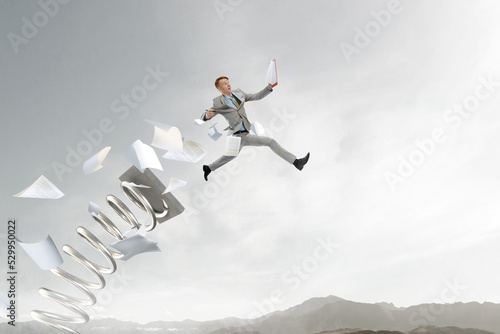 Portrait of energetic businessman jumping in open air