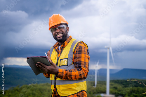 Portrait of engineer African American man working with laptop in wind turbine farm.