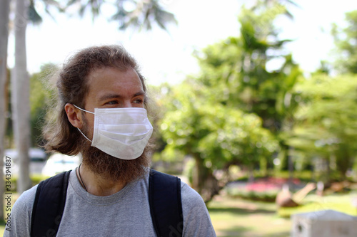 Portrait of European man on a background of summer tropical park with medical face mask for protect himself from coronavirus disease, influenza virus and other infections.
