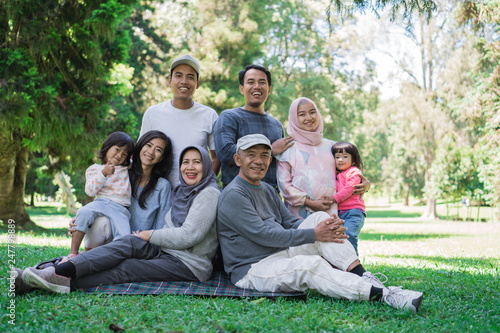 portrait of family with parent, grandparent and grandchildren together relaxing in the park