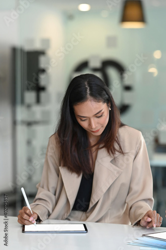 Portrait of female designer concentrate working on digital tablet while sitting at creative workspace.