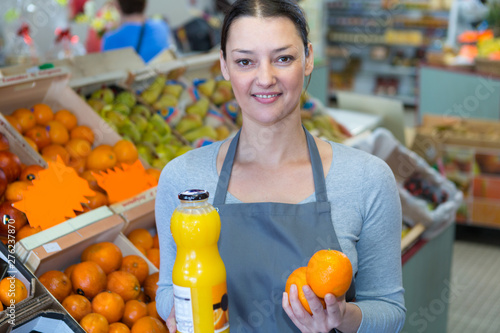 portrait of female grocer holding oranges and bottle of juice