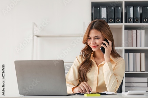 Portrait of financial business woman sitting at desk and working on laptop while making talk on the phone