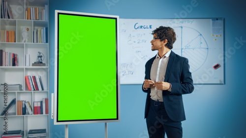 Portrait of Friendly Teacher Explains Lesson to a Classroom, Uses Green Screen Digital Whiteboard. Successful Businessman Talks about Project Growth Uses Chroma Key Digital Blackboard
